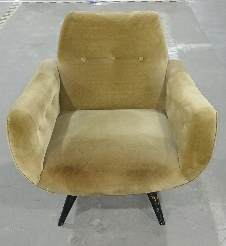 Poltrona pés palito preto com botonê no encosto e parte interna dos braços, com pontos de desgaste no estofado, devido ao tempo e uso