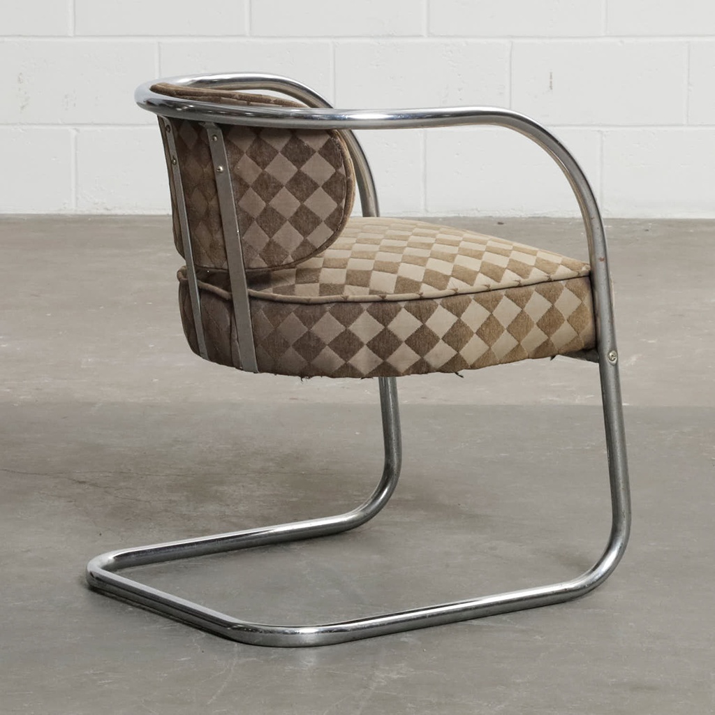 Poltrona pé de ferro com estofado geométrico na cor bege e bege escuro.