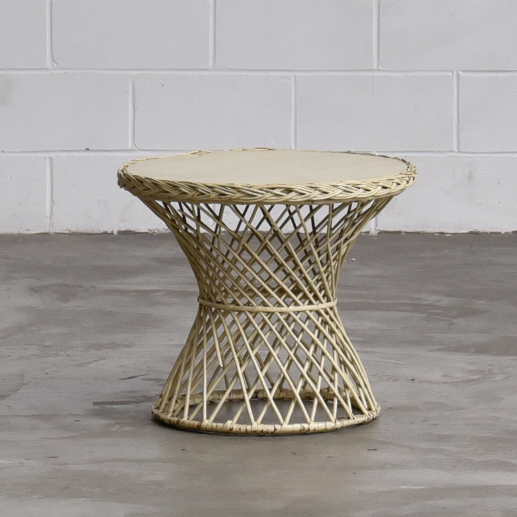 Mesa redonda de junco branca, com pontos de desgaste e manchas