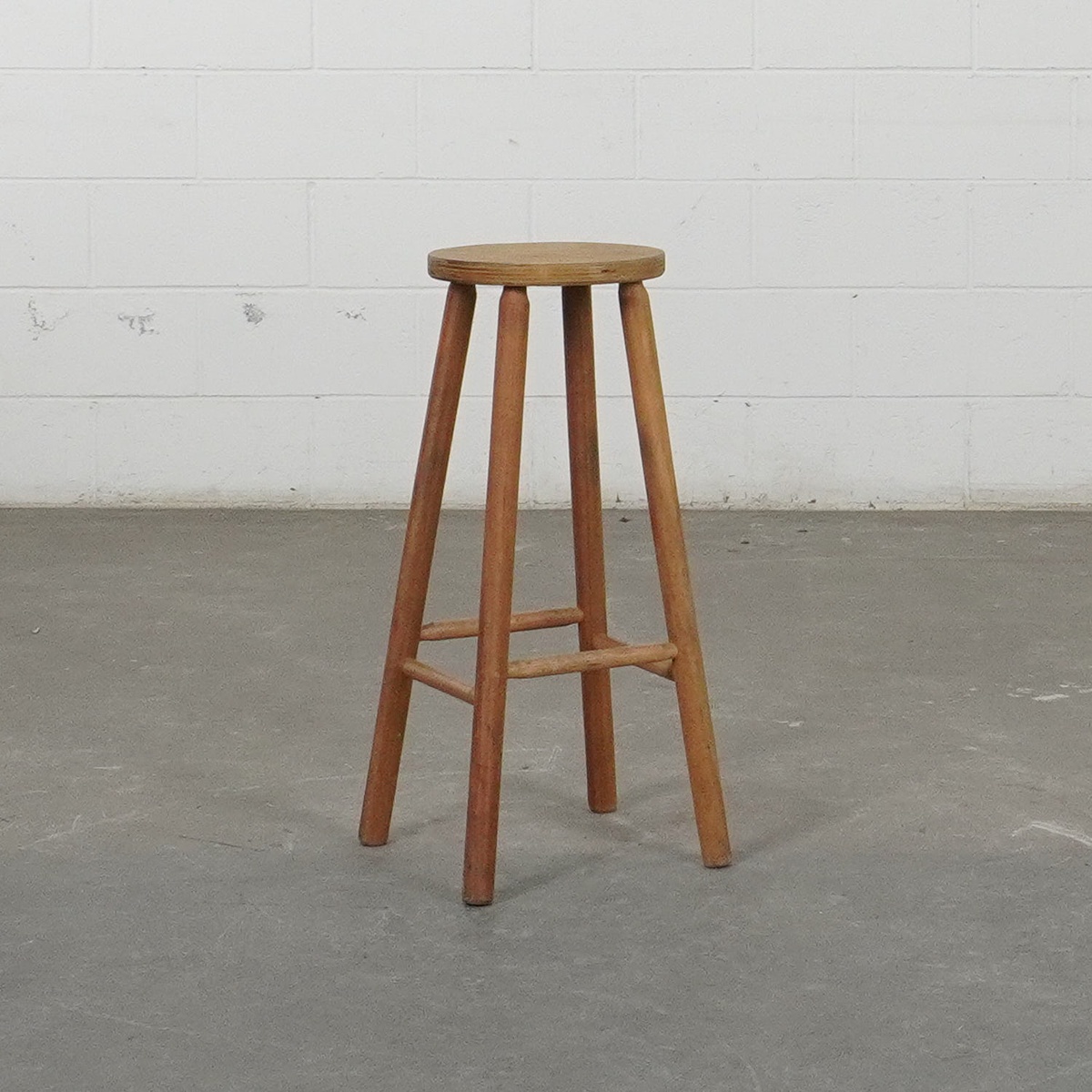 Bancos alto de madeira com assento redondo e design minimalista. A estrutura simples, com apoio para os pés, em madeira clara.
