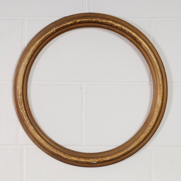 Moldura redonda vazia em madeira dourada envelhecida, apresenta alguns desgastes na pintura, alguns lascados e marcas de tempo e de uso