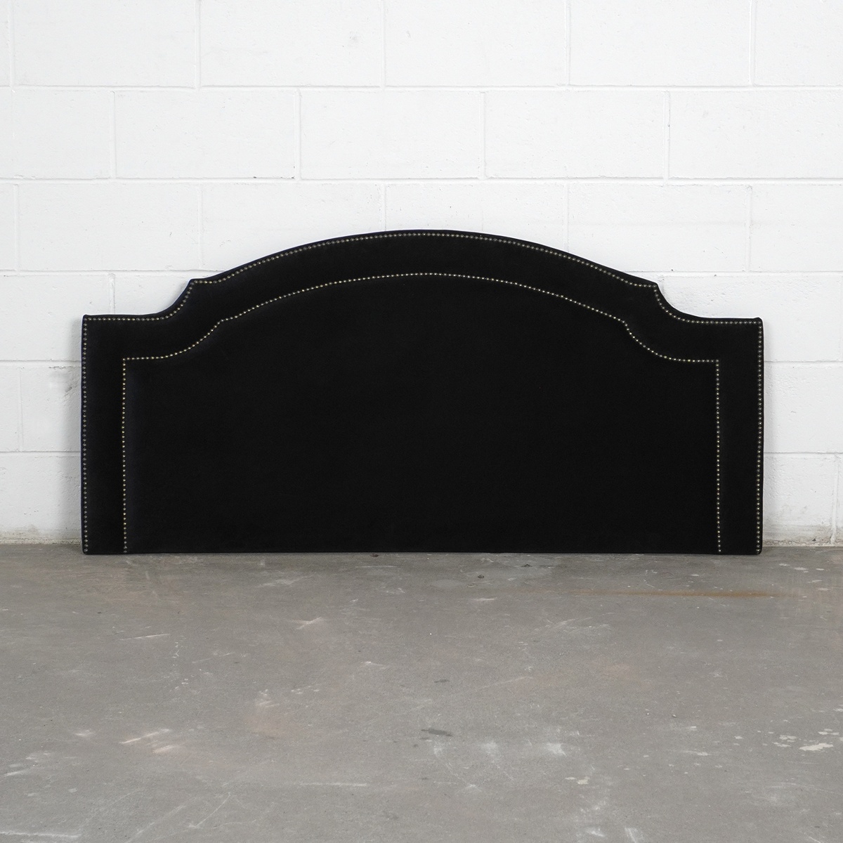 Cabeceira de cama de casal com revestimento de veludo preto e detalhes de tachas