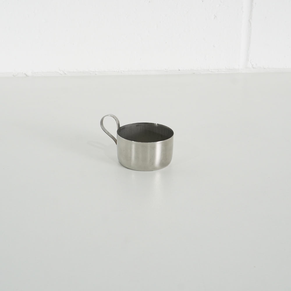 Suporte com alça para xícara de café sem alça em aço inox, apresenta desgastes e marcas de tempo e de uso.