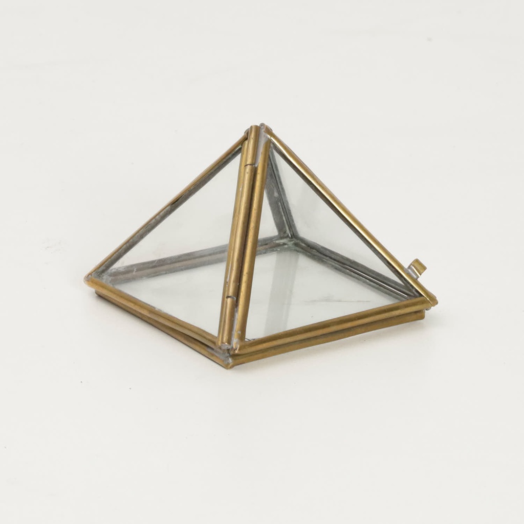 Pirâmide de vidro P com ferro dourado, a pirâmide abre. Apresenta marcas de tempo e de uso