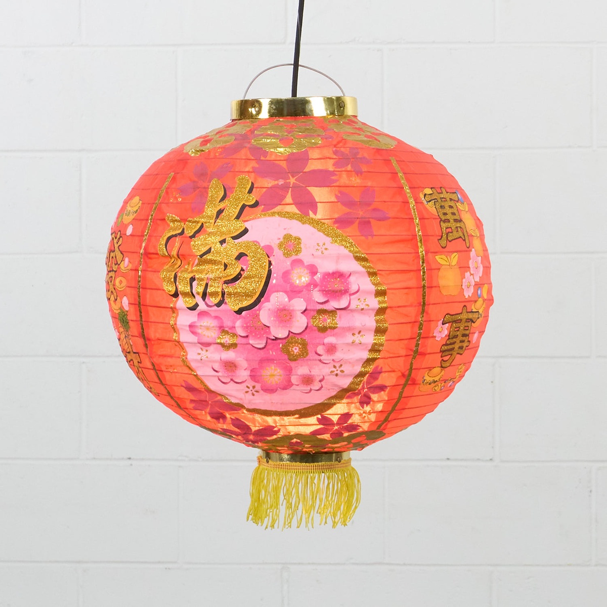 Lanterna japonesa de tecido vermelha com ideogramas e franjas amarelas