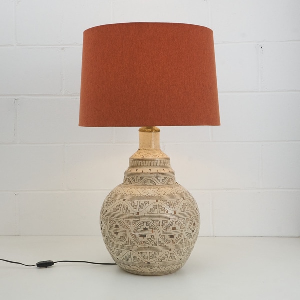 Base de abajur bojudo em cerâmica com grafismos atribuídos a região do Marajó, compatível com cúpulas tamanho G 🟢, aro convencional.