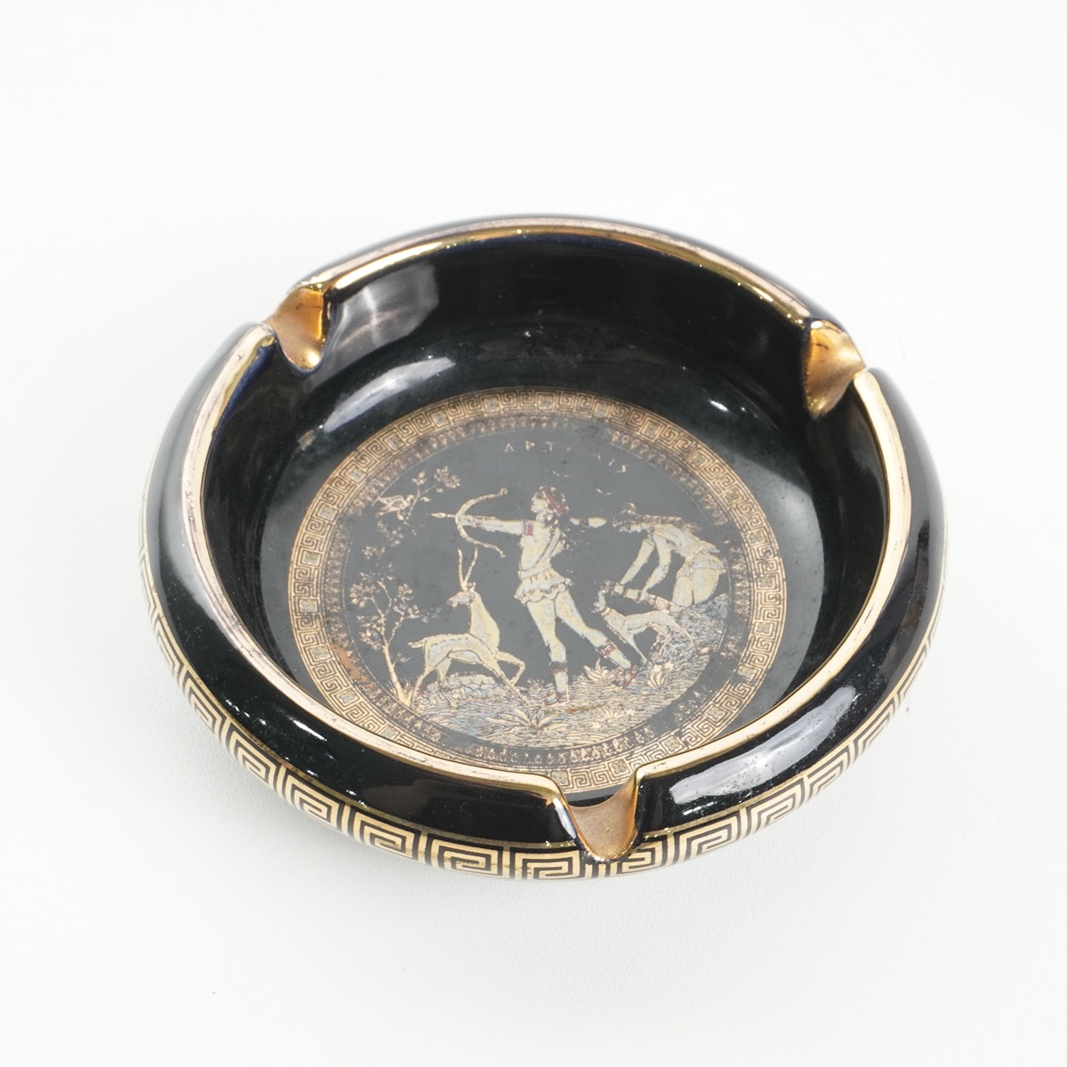 Cinzeiro redondo grande em cerâmica preta com desenho grego em dourado, apresenta marcas de tempo e de uso