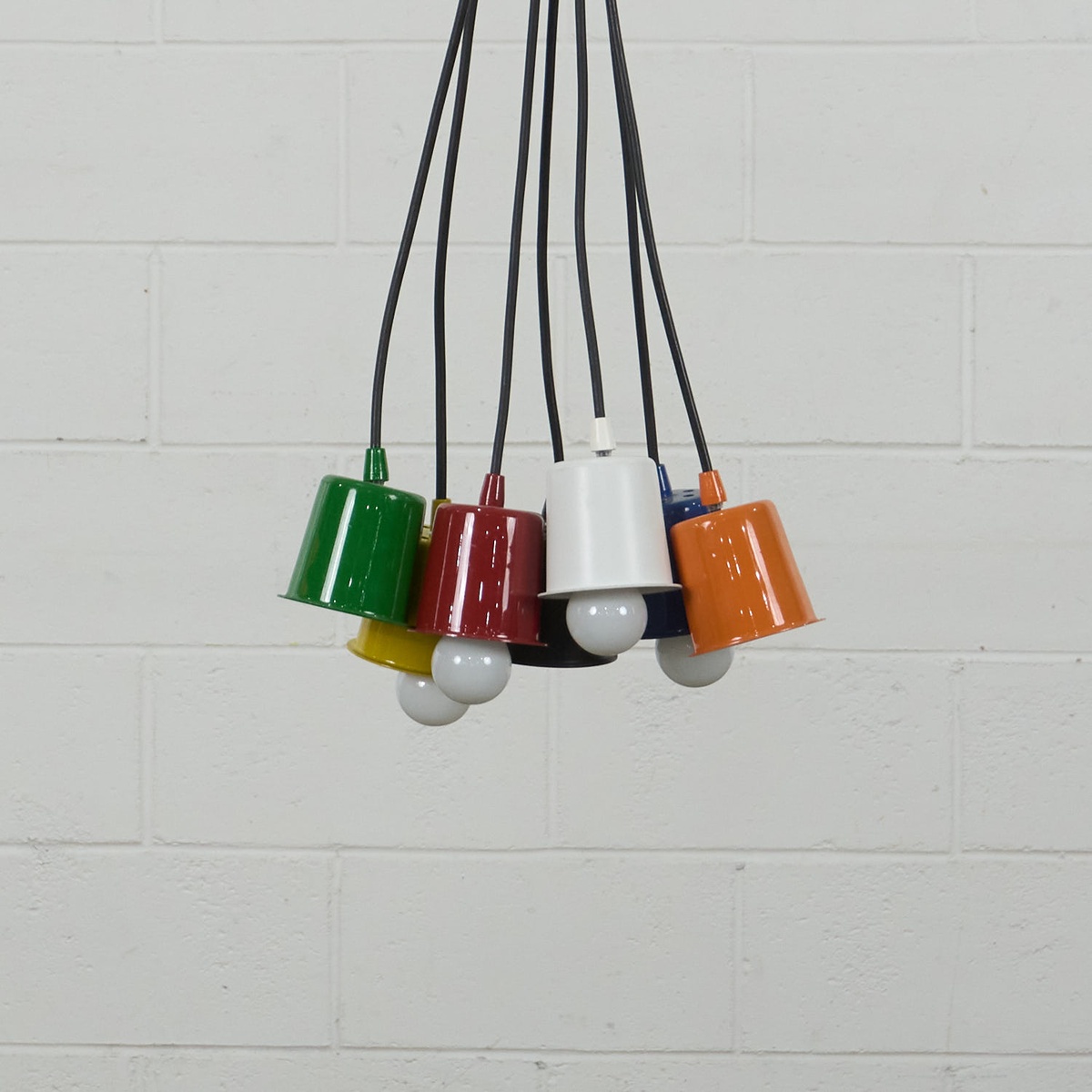 Luminária pendente copos metálicos coloridos ligados a cabo de borracha preto