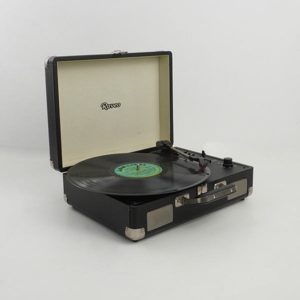 Vitrola maleta em couro sintético e cantoneira em metal cromado. Funcionando perfeitamente, inclui agulha e cabo.