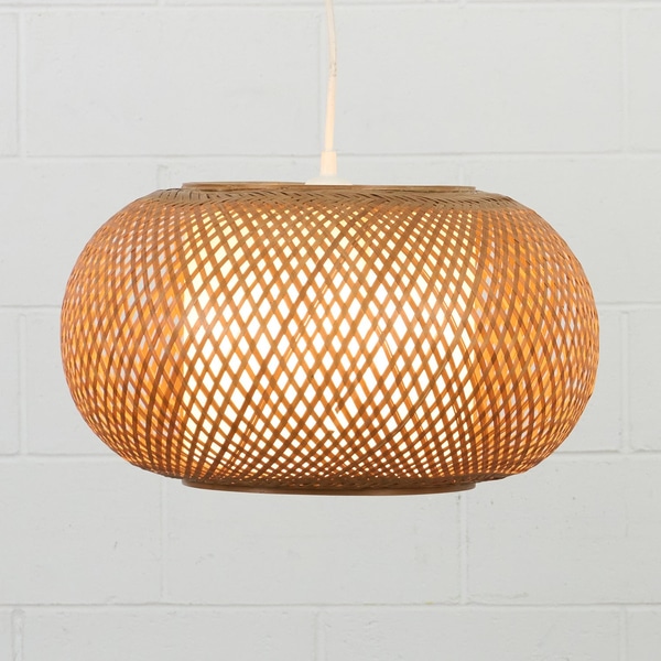 Luminária de palha Vime Rattan estilo lanterna, apresenta estrutura fragilizada.