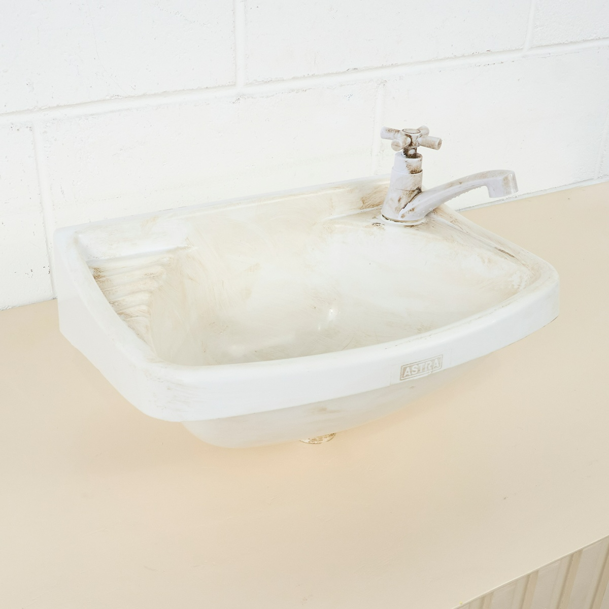 Pia com torneira em material plástico, apresenta pintura de arte simulando sujeira
