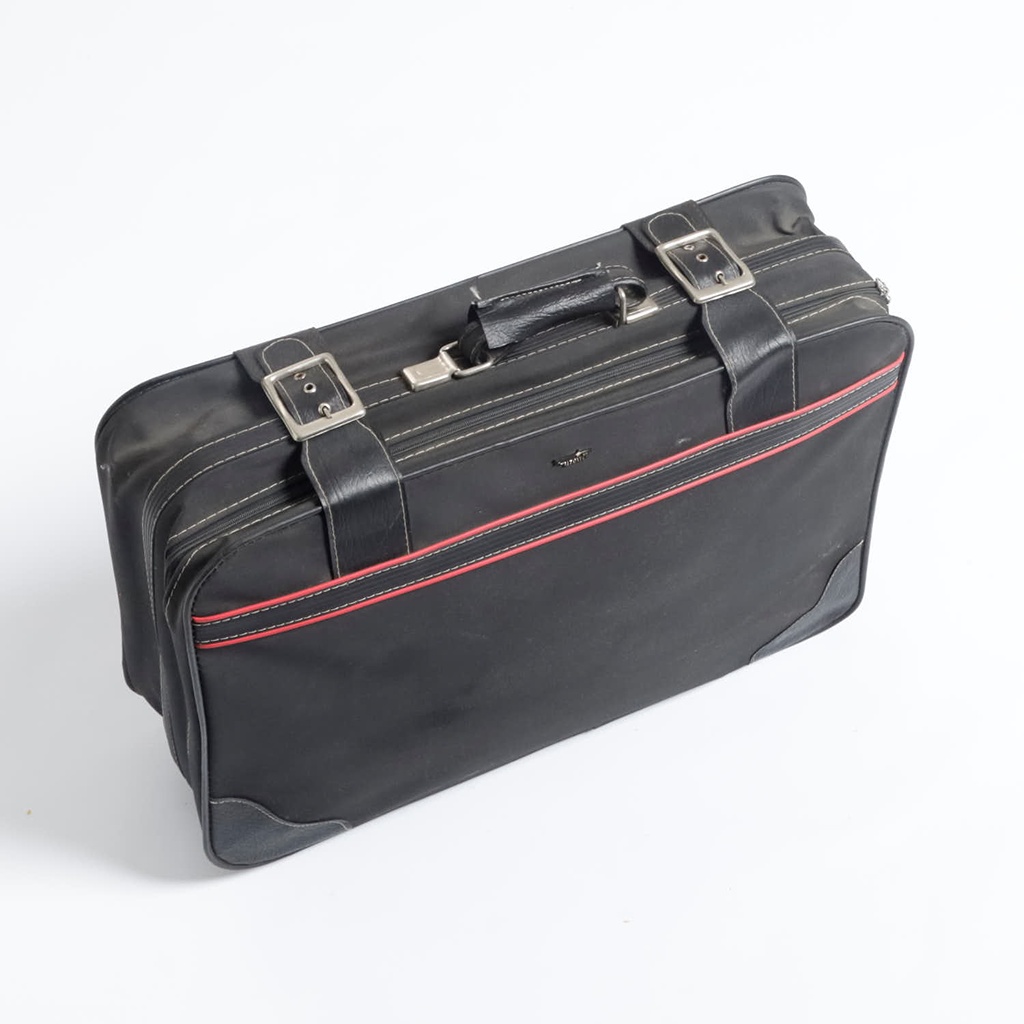 Mala de viagem preta frizo vermelho cruzeiro com alças e puxadores em couro.