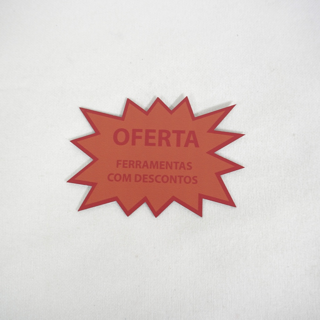 Placa comunicação visual PS menor "Oferta Ferramentas com Desconto" na cor terracota.
