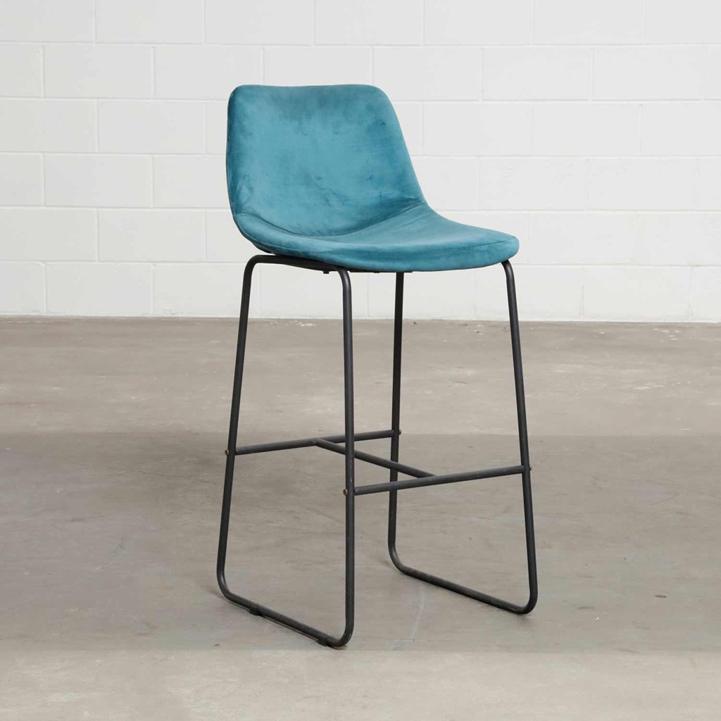 Banqueta alta azul petróleo, assento camurça e pés em metal.