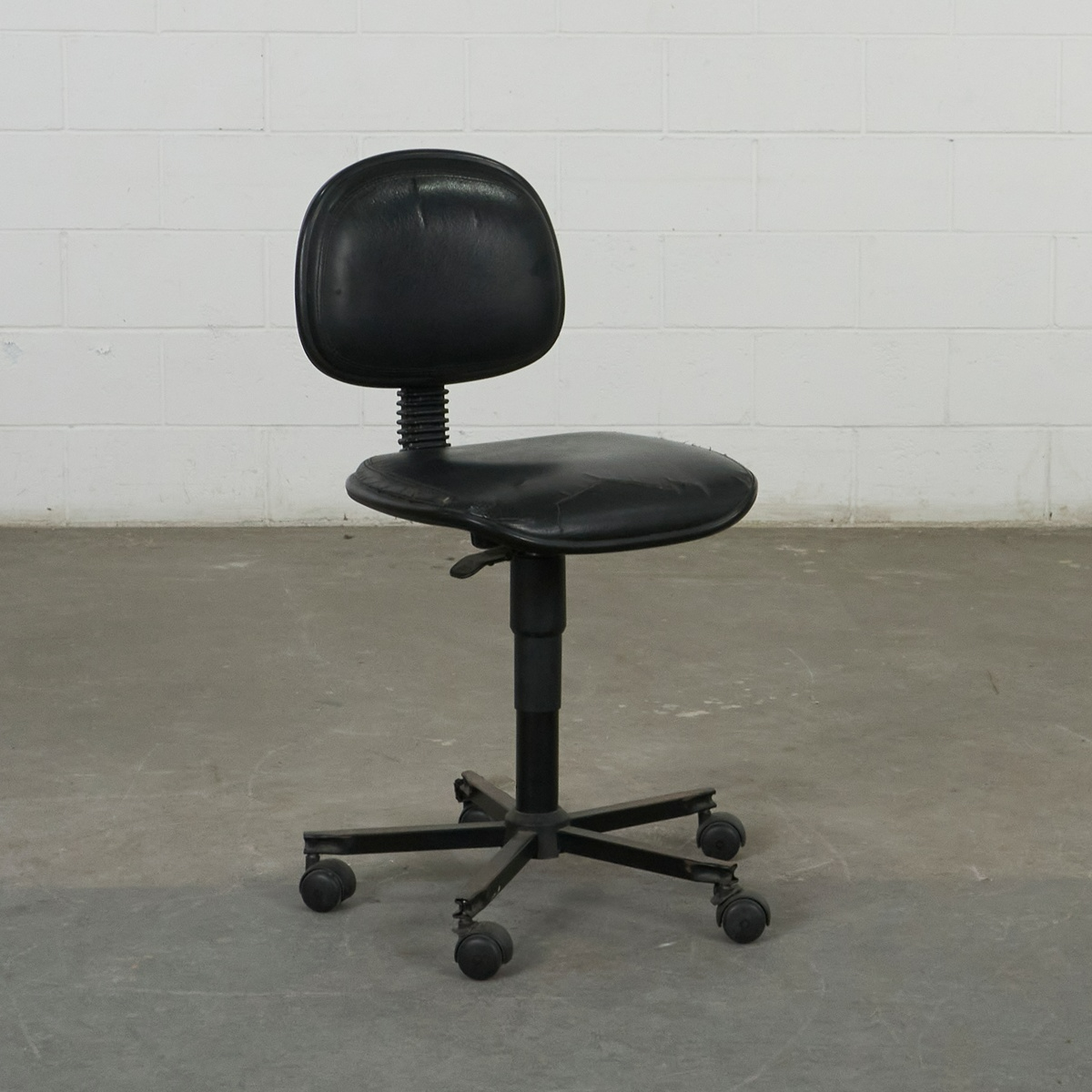 Cadeira com rodízios em couro preto e estrutura de metal, apresenta pontos de desgastes e craquelados no couro decorrente do tempo e uso
