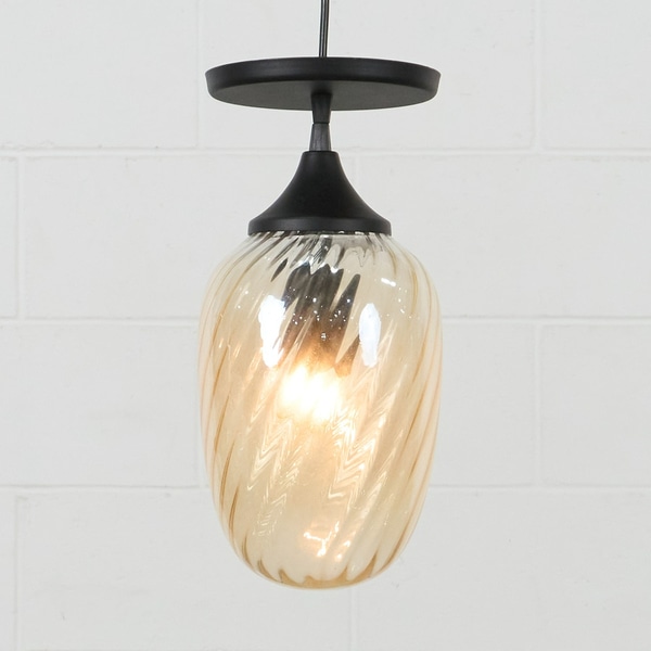Luminária pendente com cúpula de vidro canelado retorcido rose e metais preto