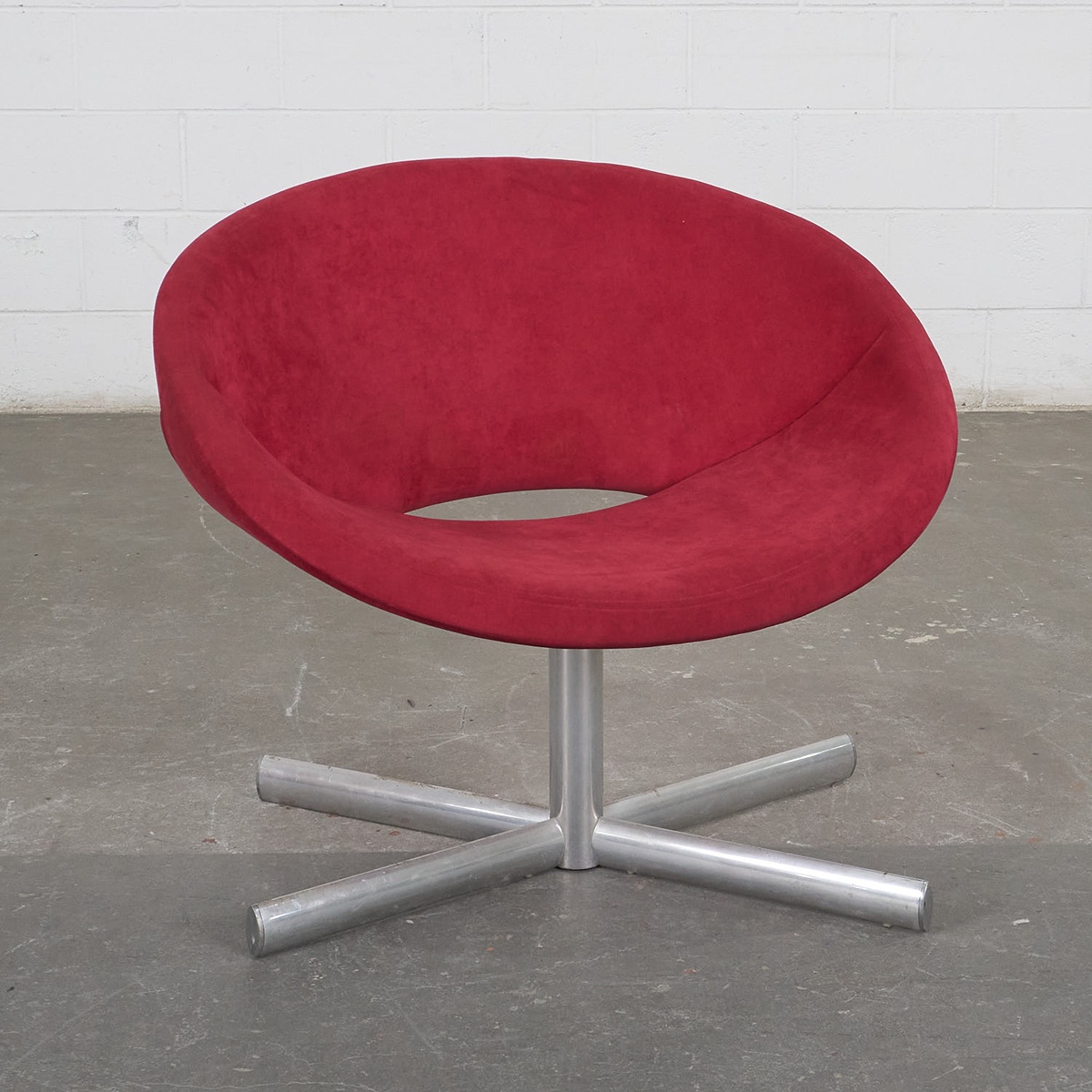 Poltrona giratória em suede rosa pink com pés metálicos cromados, apresenta pontos de oxidação e arranhados no metal decorrente do tempo e u...