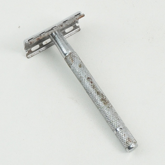 Barbeador com local para encaixe de lâmina, apresenta pequenos desgastes de oxidação decorrente do tempo e uso