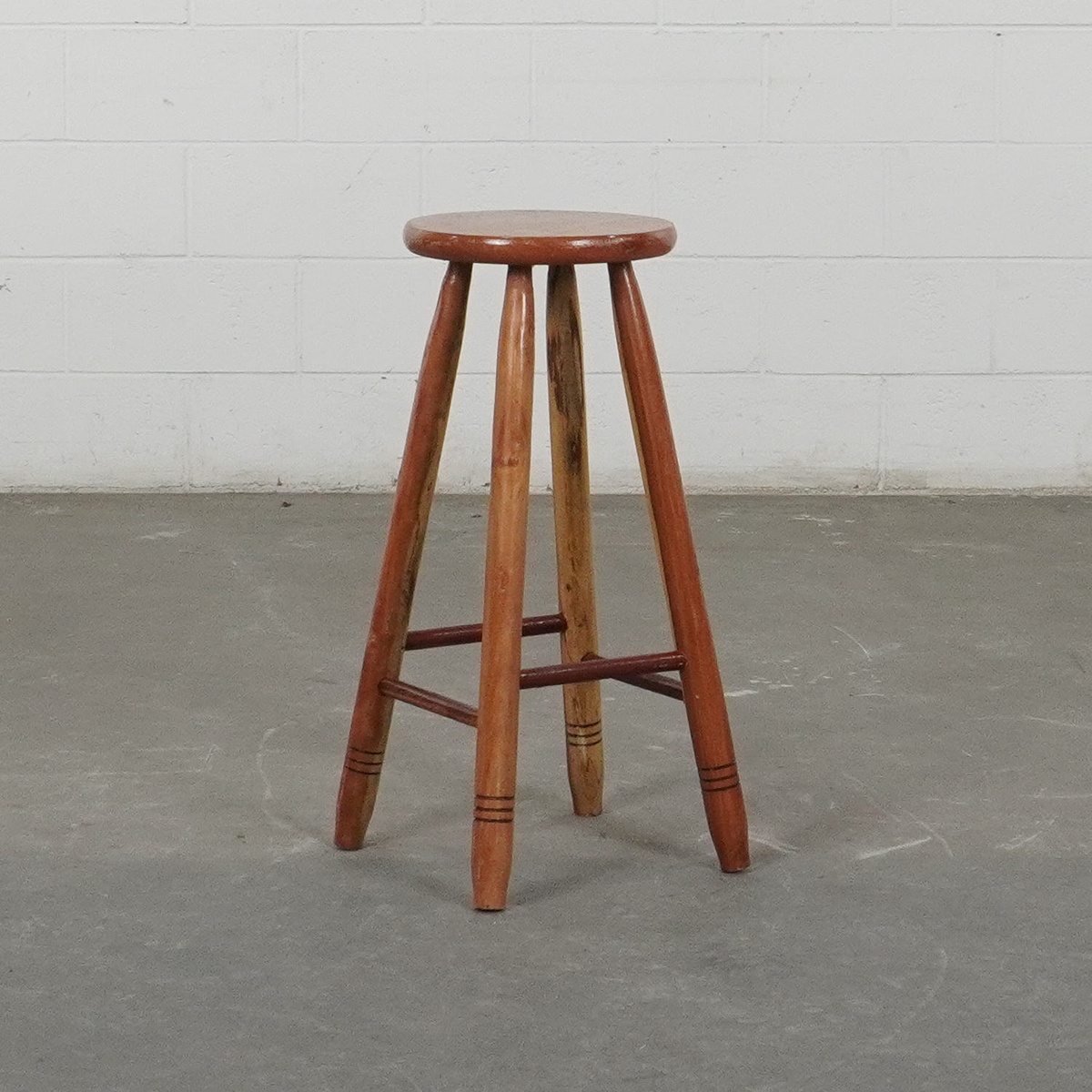 Banco alto de madeira com assento redondo e pernas torneadas. A peça possui acabamento em tom de madeira avermelhada e detalhes entalhados n...