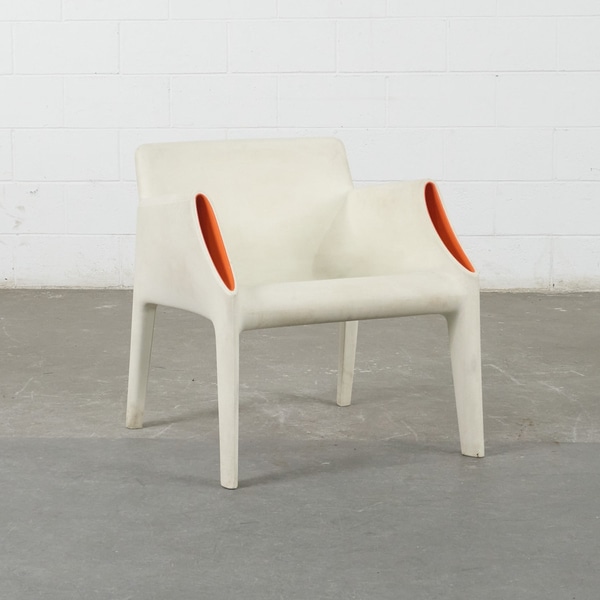Cadeira de plástico branca com detalhe laranja nos braços. Apresenta pontos de desgastes e manchas devido o tempo e uso.