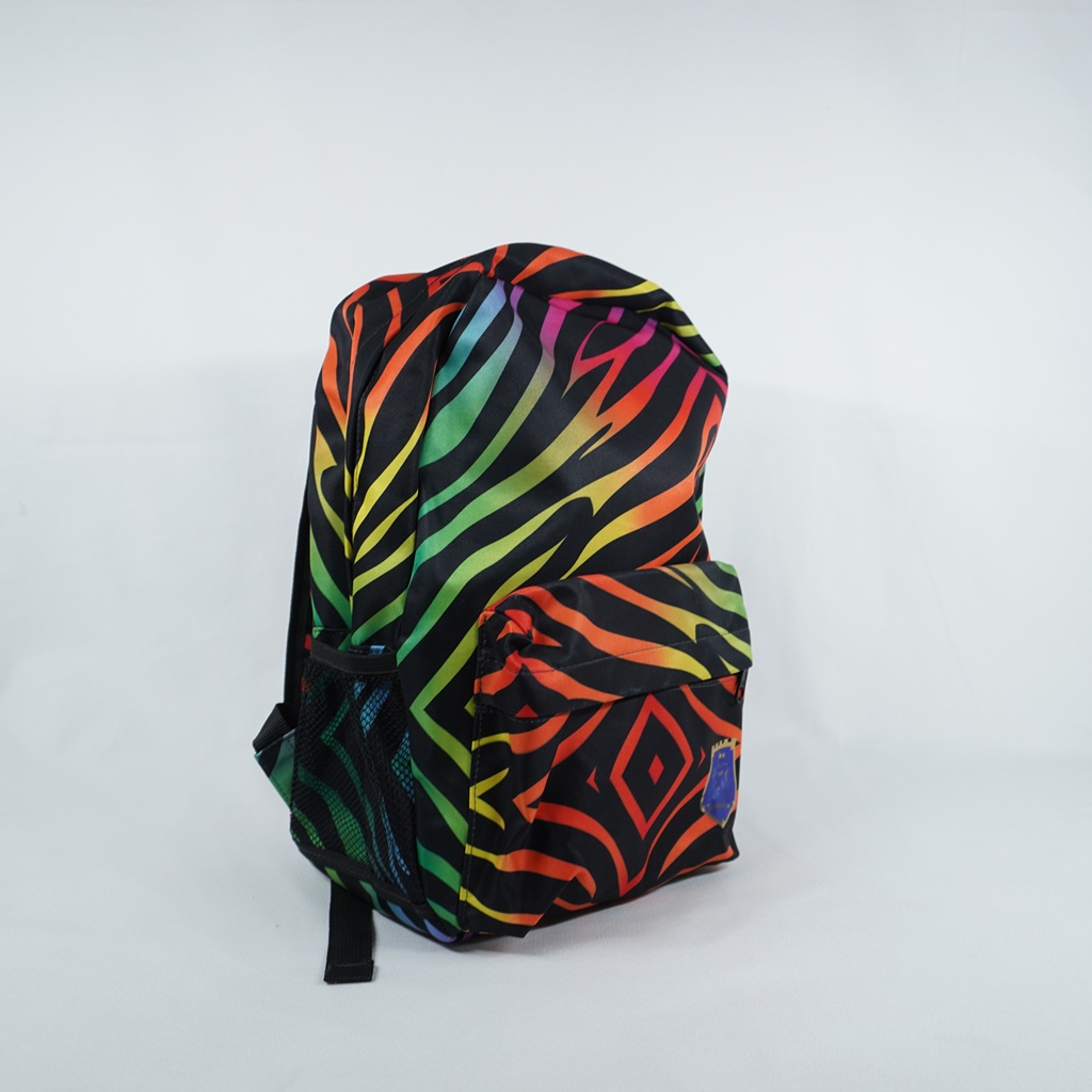 Mochila castellum com linhas neons, em padrão animal print semelhante de zebra, sobre fundo preto