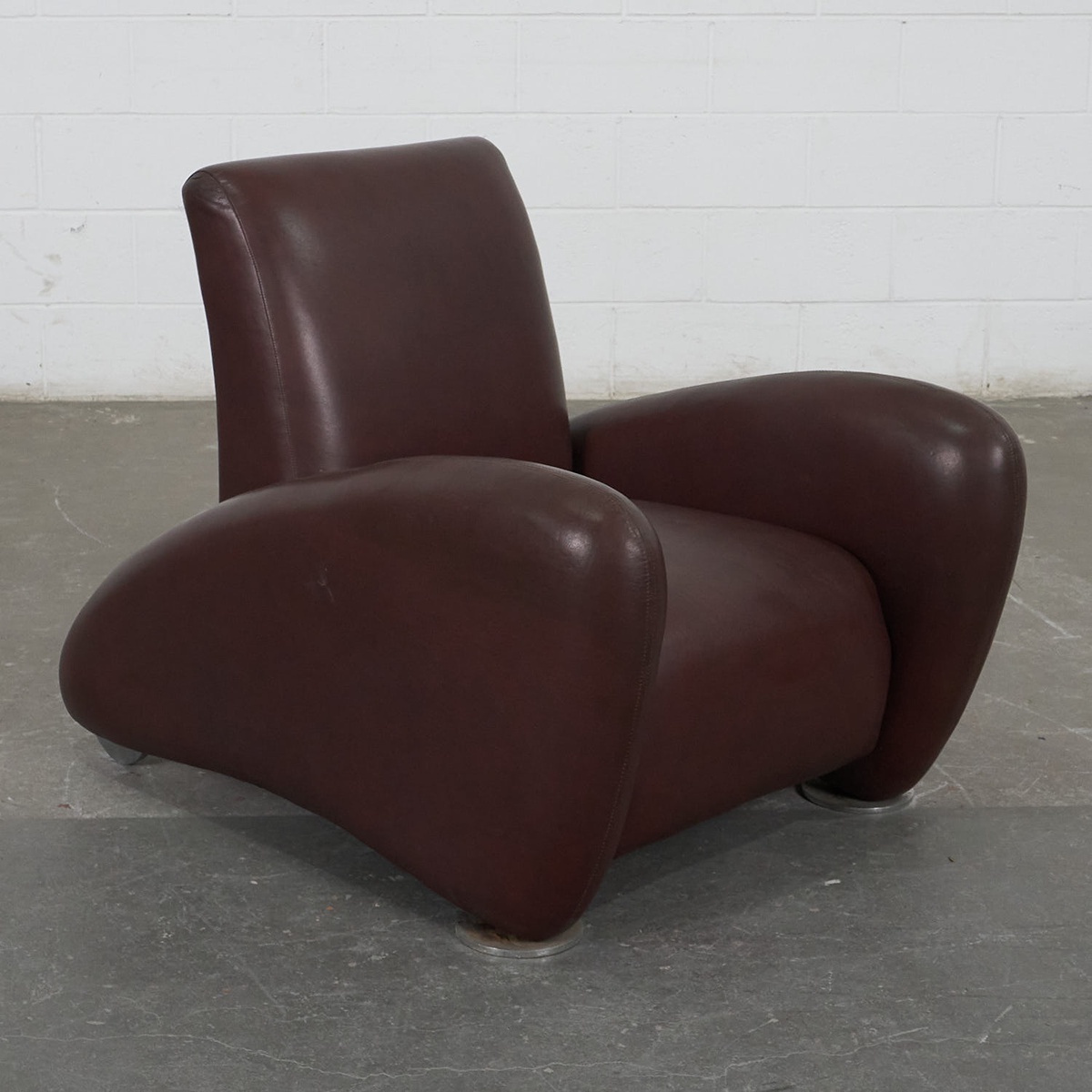 Poltrona de couro bordô com pés metálicos cromados, apresenta pequenos pontos arranhados no couro e oxidação no metal