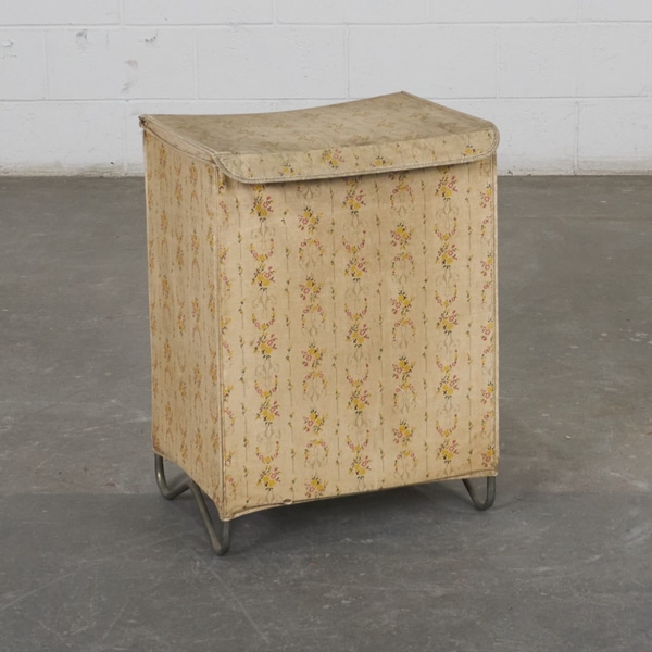 Cesta de roupas vintage com estrutura metálica e napa floral bege, apresenta pontos de desgastes decorrente do tempo e uso