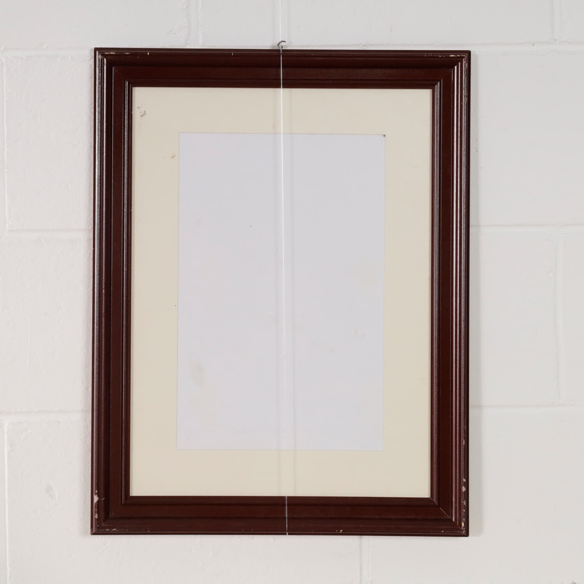 Moldura com vidro, em madeira sobreposta escura e paspatur branco, apresenta manchas pretas e amareladas no paspatur, lascados e bastante ma...