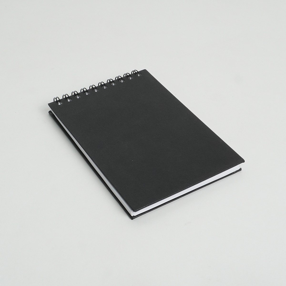 Caderno capa dura retangular preta com espiral em ferro preto, pautado, apresenta pequenas manchas brancas e marcas de tempo e de uso