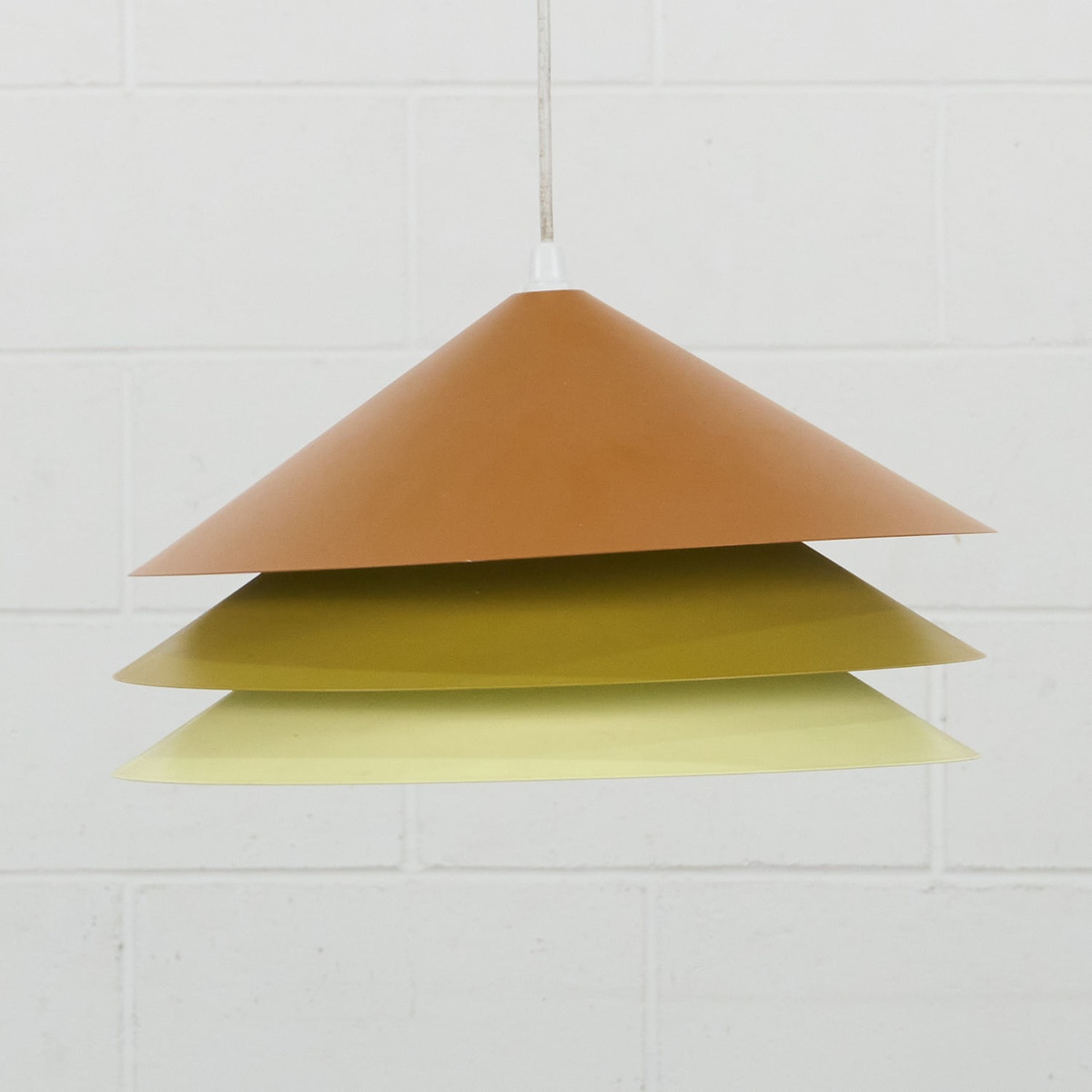 Luminária pendente com cúpula cônica de metal em tons de amarelo.