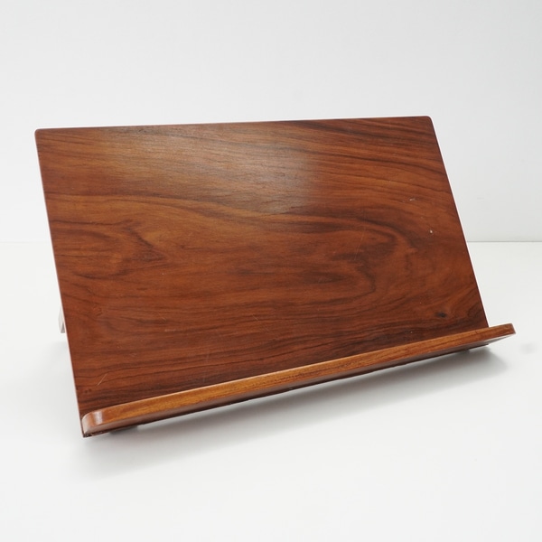 Em madeira escura com angulação regulável, apresenta reparo na base frontal, está colada, e apresenta marcas de tempo e de uso