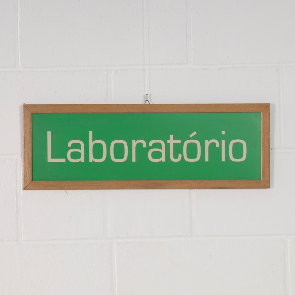 Placa retangular de sinalização laboratório em moldura de madeira clara e madeira verde com detalhe em branco, para pendurar em paredes de l...