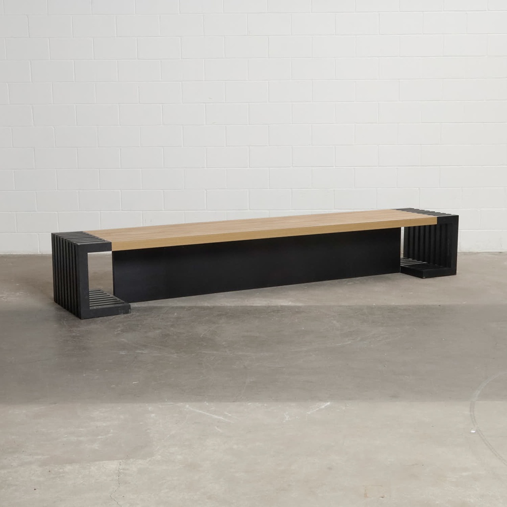 Banco ripado preto e madeira clara, apresenta pequenos desgastes decorrente ao tempo e uso.